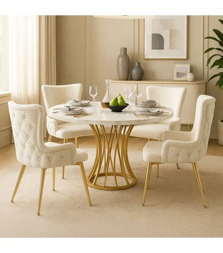 Ensemble de salle à manger de style scandinave avec une table à manger effet marbre blanc et des chaises rembourrées en velours beige KROGZEX GOLD+CRORQREONS BEIGE G*2 Cet ensemble de salle à manger élégant et moderne transformera votre salle à manger, que ce soit pour un dîner décontracté ou des réceptions élégantes. Son plateau effet marbre blanc raffiné apporte une touche de sophistication, tandis que sa structure robuste et élégante en métal doré foncé crée une ambiance chic et moderne qui s'intègre parfaitement à tout décor moderne. Les quatre chaises assorties sont recouvertes de velours doux pour plus de confort et de style. Leur conception ergonomique offre un soutien optimal, idéal pour les repas prolongés ou les conversations informelles. Cet ensemble de salle à manger s'adapte à une variété d'environnements, des cuisines modernes aux salles à manger, alliant praticité et esthétique. Sa palette de couleurs neutres et ses matériaux de haute qualité le rendent polyvalent et ...