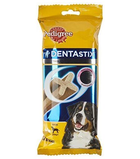 Pedigree Dentastix Large Dogà are clinically proven to reduce up to 8% of tartar build - up when used daily. Plaque is a common problem in most dogs, which when left untreated can cause bad breath, swollen and bleeding gums and eating less due to sore teeth and gums. The unique shape and texture of the chew helps to clean between the teeth and gums, without the hassle of brushing. Each pack contains 2 delicious chicken and beef flavours and is foil wrapped to maintain freshness. Large Denta stix for dogs weighing more than 25Kg. ...