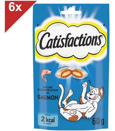 Aliment complémentaire pour chats adultes et chatons de plus de 8 semaines - Au Saumon. Délicieuses friandises Catisfactions craquantes à l'extérieur et tendres à l'intérieur pour lesquelles les chats feraient n'importe quoi ! Non, nous n'utilisons pas de truc secret ou de la magie pour les rendre si délicieuses ; mais tous plein d'ingrédients que les chats adorent. Allez, secouez le sachet et vous verrez votre chat accourir ! Moins de 2 kcal par friandise, ces friandises sont sans arôme artificiel. Friandise pour chat mise au point avec nos nutritionnistes et nos vétérinaires du centre de recherche WALTHAM - Principale référence mondiale pour la nutrition et le bien-être des animaux de compagnie. Friandises pour chat adulte et pour chaton de plus de 8 semaines Craquantes à l'extérieur avec un délicieux coeur tendre Moins de 2 calories par friandise Sans arôme artificiel Sachet refermable pour une meilleure conservation Additifs par kg : Antioxygènes et Colorants ; Additifs nutritionnels : Vitamine A : 1293 UI, Vitamine B1 : 9.9 mg, Vitamine B2 : 16.9 mg, Vitamine B6 : 4.4 mg, Vitamine D3 : 143 UI, Vitamine E : 115 mg, Cuivre (Sulfate de cuivre (II) pentahydraté) : 6.8 mg, Iode (Iodure de potassium) : 1.7 mg, Manganèse (Sulfate manganeux, monohydraté) : 14.1 mg, Zinc (Sulfate de zinc, monohydraté) : 70.5 mg A conserver dans un endroit frais et sec. Une fois ouvert, bien refermer l'emballage et à consommer dans les 8 semaines. Les situations cocasses ne manquent pas lorsque l'on partage son domicile avec un chat. Amusants, tendres ou surprenants, nos amis félins n'ont pas fini de nous émerveiller et surtout de nous faire rire. Grâce à ses délicieuses friandises, Catisfactions vous offre l'occasion de renforcer votre complicité avec votre chat. Amusez-vous et partagez jour après jour des moments privilégiés avec votre petit félin. ...