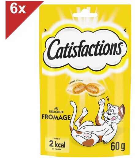 Aliment complémentaire pour chats adultes et chatons de plus de 8 semaines - Au Fromage. Délicieuses friandises Catisfactions craquantes à l'extérieur et tendres à l'intérieur pour lesquelles les chats feraient n'importe quoi ! Non, nous n'utilisons pas de truc secret ou de la magie pour les rendre si délicieuses ; mais tous plein d'ingrédients que les chats adorent. Allez, secouez le sachet et vous verrez votre chat accourir ! Moins de 2 kcal par friandise, ces friandises sont sans arôme artificiel. Friandise pour chat mise au point avec nos nutritionnistes et nos vétérinaires du centre de recherche WALTHAM - Principale référence mondiale pour la nutrition et le bien-être des animaux de compagnie. Friandises pour chat adulte et pour chaton de plus de 8 semaines Craquantes à l'extérieur avec un délicieux coeur tendre Moins de 2 calories par friandise Sans arôme artificiel Sachet refermable pour une meilleure conservation Additifs par kg : Antioxygènes et Colorants ; Additifs nutritionnels : Vitamine A : 1293 UI, Vitamine B1 : 9.9 mg, Vitamine B2 : 16.9 mg, Vitamine B6 : 4.4 mg, Vitamine D3 : 143 UI, Vitamine E : 115 mg, Cuivre (Sulfate de cuivre (II) pentahydraté) : 6.8 mg, Iode (Iodure de potassium) : 1.7 mg, Manganèse (Sulfate manganeux, monohydraté) : 14.1 mg, Zinc (Sulfate de zinc, monohydraté) : 70.5 mg. A conserver dans un endroit frais et sec. Une fois ouvert, bien refermer l'emballage et à consommer dans les 8 semaines. Les situations cocasses ne manquent pas lorsque l'on partage son domicile avec un chat. Amusants, tendres ou surprenants, nos amis félins n'ont pas fini de nous émerveiller et surtout de nous faire rire. Grâce à ses délicieuses friandises, Catisfactions vous offre l'occasion de renforcer votre complicité avec votre chat. Amusez-vous et partagez jour après jour des moments privilégiés avec votre petit félin. ...