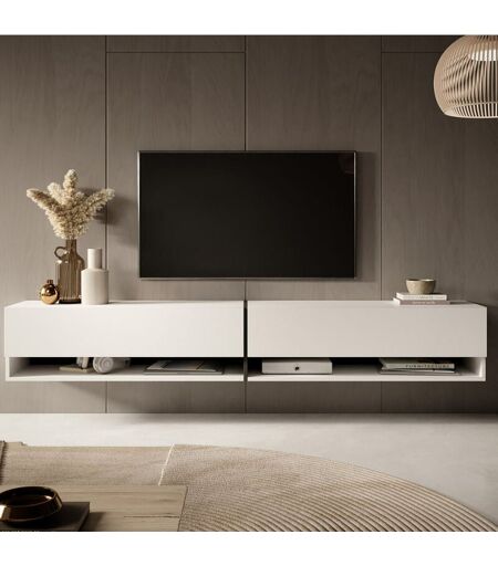 Description générale Le meuble TV Mirrgo allie élégance et fonctionnalité. Avec sa forme minimaliste et sa couleur tendance imitant le marbre, il constitue une pièce maîtresse pour votre salon. Ses deux armoires verrouillables permettent de dissimuler les jeux de console, câbles et autres petits objets, tandis que les étagères ouvertes offrent un espace idéal pour un décodeur ou un livre. Spécifications techniques Matériau : panneau stratifié de 16 mm, résistant à l'humidité et aux rayures Façades des armoires : s'ouvrent vers le bas Largeur du meuble : 200 cm Couleur : blanc et graphite Compatibilité et accessoires Le meuble est compatible avec la plupart des téléviseurs, mais il est conseillé de vérifier les dimensions de votre téléviseur pour garantir un bon ajustement. Installation Le meuble TV nécessite un assemblage simple. Assurez-vous de suivre les instructions fournies pour un montage réussi. Utilisation Idéal pour organiser votre espace de divertissement, ce meuble peut ...