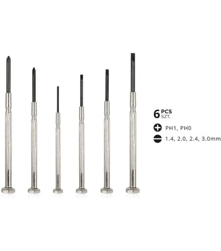 Le jeu contient les tournevis les plus nécessaires. CONTENU DU JEU : PH-0 Phillips PH-1 Phillips plat 1,4 mm plat 2,0 mm plat 2,4 mm plat 3,0 mm ...