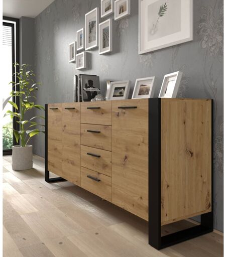 BIM FURNITURE Commode nuka k Sideboard 197x45x87 cm Chêne Artisan/Noir Mat avec 3 portes et 4 tiroirs, commode pour salon, grand espace de rangement