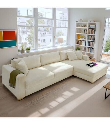 HOMIFAB Canapé D'angle Droit Convertible 5 Places En Velours Côtelé Beige