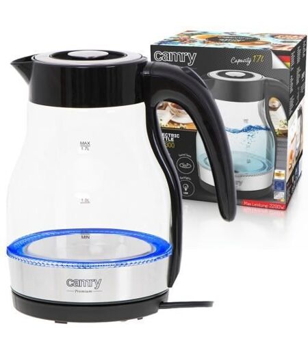Bouilloire en verre Camry CR 1300 1,7 L Une grande bouilloire électrique familiale, capable de faire bouillir efficacement l'eau pour le thé pour 6-7 personnes grâce à sa puissance de 2200W. Équipé d'un indicateur de niveau d'eau clair. ...