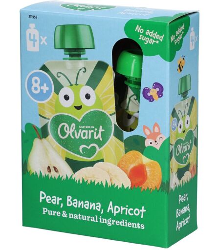 Olvarit propose une large gamme de produits pour bébé adaptés de 4 à 36 mois. Les Gourdes Poire, Banane & Abricot 8+M Olvarit sont exemptes de sucres ajoutés, sont riches en fruits purs et conviennent particulièrement bien comme en-cas sain pour votre bébé ! Si votre petit bout peut déjà tenir et presser la gourde, vous pouvez lui l'offrir directement. Sinon, vous pouvez verser la quantité souhaitée sur une assiette ou dans un bol. Votre bambin ne finit pas la gourde ? Conservez la gourde dans un récipient fermable et offrez le contenu restant à votre bébé dans les 24 heures. Les gourdes Olvarit sont sans sucres ajoutés*, riches en fruits purs et facile à emporter! Le goût et la texture sont adaptés à l'âge de votre bébé pour supporter un bon développement du goût. Des ingrédients purs. Sans conservateurs**. * Contient des sucres naturellement présents. **Olvarit ne contient pas de conservateurs, comme les autres aliments pour bébé. 42,5% poire, 40% banane, 17,5% abricot, acide L-ascorbique, jus de citron concentré. Énergie en kJ 271 KJoule, Graisses 0,2 gram, dont saturés 0 gram, Glucides 13,6 gram, dont sucres 13,5 gram, Fibres alimentaires 2,6 gram, Protéines 0,7 gram, Sel 0 gram ...