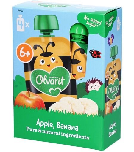 Il est important d'avoir une alimentation variée et équilibrée et un mode de vie sain.Olvarit propose une large gamme de produits pour bébé adaptés de 4 à 36 mois.Les Gourdes Pomme & Banane 6+M Olvarit sont exemptes de sucres ajoutés, sont riches en fruits purs et conviennent particulièrement bien comme en-cas sain pour votre bébé !Si votre petit bout peut déjà tenir et presser la gourde, vous pouvez lui l'offrir directement. Sinon, vous pouvez verser la quantité souhaitée sur une assiette ou dans un bol. Votre bambin ne finit pas la gourde ? Conservez la gourde dans un récipient fermable et offrez le contenu restant à votre bébé dans les 24 heures.BénéficesLes gourdes Olvarit sont sans sucres ajoutés*, riches en fruits purs et facile à emporter! Le goût et la texture sont adaptés à l'âge de votre bébé pour supporter un bon développement du goût.Des ingrédients purs.Sans conservateurs**.* Contient des sucres naturellement présents.**Olvarit ne contient pas de conservateurs, comme les autres aliments pour bébé.Ingrédients76% pomme, 24% banane, acide L-ascorbique, jus de citron concentré.Données nutritionnellesÉnergie en kJ 271 KJoule, Graisses 0,1 gram, dont saturés 0 gram, Glucides 14,5 gram, dont sucres 14,3 gram, Fibres alimentaires 1,7 gram, Protéines 0,4 gram, Sel 0 gramPrécautions d'emploi Conserver au frais et au sec. Garder en dehors de portée des jeunes enfants. Ne pas dépasser la dose recommandée.Poids net4x100 gFabricantDanone BeluxQuai des Usines 159-160, 1000 Bruxelles Belgique ...