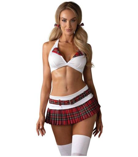 Ce ravissant costume 5 pièces étudiante sexy d'Obsessive vous rappellera les bancs de l'école dans sa version la plus érotique... Laissez-vous aller à surprendre votre partenaire dans cette tenue sexy et équivoque. Le haut décolleté va sublimer votre décolleté. La mini jupe avec une ceinture aux couleurs écossaises pour encore plus de sensualité. Un string sexy, 2 pinces à cheveux décorées avec des noeuds et bas blanc inclus pour compléter la tenue. Avec cette tenue le tableau noir ne vous fait pas peur, lancez vous à la séduction de votre professeur.    Lavable en machine. Taille unique S/M. ...
