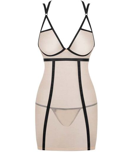 Découvrez la Nuisette Nudelia Beige & Noire de la marque Obsessive et faites succomber de désir votre partenaire. Cette adorable nuisette d'un beige doux tout en maille fine transparente sublimera vos formes pour un effet glamour sans précédent grâce à ses bordures noires opaques. Votre poitrine sera parfaitement mise en valeur grâce aux bonnets transparents soulignés de bordures noires. Les doubles bretelles réglables dans votre dos vous habilleront avec élégance. Le reste de la nuisette toujours en maille fine transparente beige est aussi confectionné avec des fines lanières noires très romantiques afin de marquer votre taille. Sa coupe fluide et son ouverture dans le dos offrent une sensualité irrésistible grâce à son tissu frivole. Sa couleur beige très douce et pure ne laissera pas votre partenaire indifférent. String assorti inclus. Composition : 90% Polyamide, 10% Élasthanne Tailles S/M, L/XL. ...