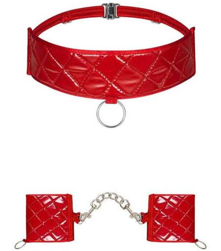 Nous vous offrons une chasse érotique. Nous sommes vos Menottes & Choker Hunteria de la marque Obsessive ! D'un érotisme magnétique, nous capturons le désir de votre partenaire afin que vous puissiez jouir de nuits de pure passion. Travaillés à partir d'une matière wetlook à effet matelassé d'un rouge éclatant, les menottes agrémentées d'une chaîne argentée détachable enserrent vos poignets dans un cocon des plus luxueux. Des anneaux argentés vous permettent d'élever vos jeux coquins à un tout autre niveau et vous donner un aperçu délicieux d'un univers BDSM empli de promesses. Un choker conçu dans le même tissu matelassé écarlate s'ajoute aux menottes. Sa lanière réglable vous permet d'ajuster le collier à votre guise et son anneau métallique vous offre la possibilité d'ajouter l'accessoire de votre choix. Composition : 45% Polyuréthane, 45% Polyamide, 10% Élasthanne ...