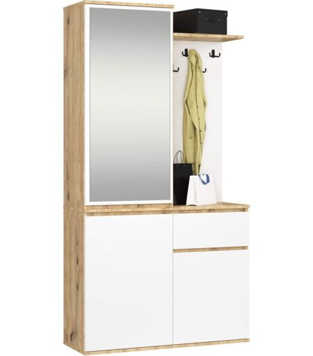 Akord - Ensemble de meubles d'entrée entro Chêne Artisan, Blanc avec armoire et miroir 95 cm 3 portes 1 tiroir 7 étagères 95x35x183 cm