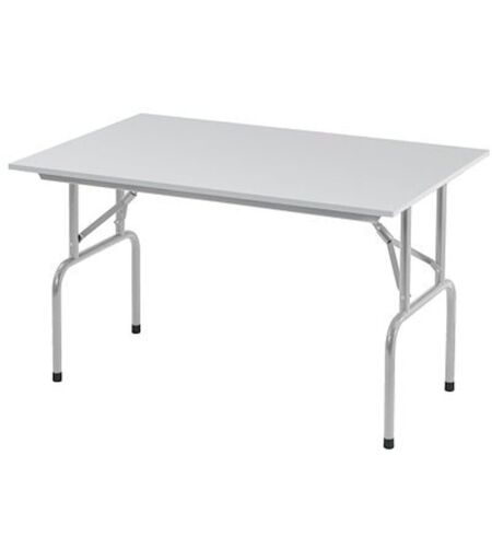 Table pliante facile à stocker Structure : plateaux panneaux de particules mélaminés épaisseur 18 mm décor gris clair. Chants antichoc épaisseur 2 mm. 2 barres de renfort pour assurer l'horizontalité du plateau 40 x 10 mm. Pieds pliants tube métal laqué époxy noir ou aluminium, tube diamètre 28 mm. Système de sécurité anti pliage des pieds par bague coulissante. Dimensions plateau : 120 x 80 cm. Hauteur 72,5 cm. Poids 19,5 kg. Livrée montée. ...