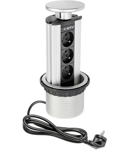 Bloc escamotable pour plan de travail d'une cuisine ou bureau. Equipé de 3 prises 2P+T 16 A / 3680 W max. Ouverture par coulissement. Alimentation : 230 V AC. Cordon de 1,8 m avec câble HO5VV-F3G1,5 mm². Ø de perçage : 104 mm. ...