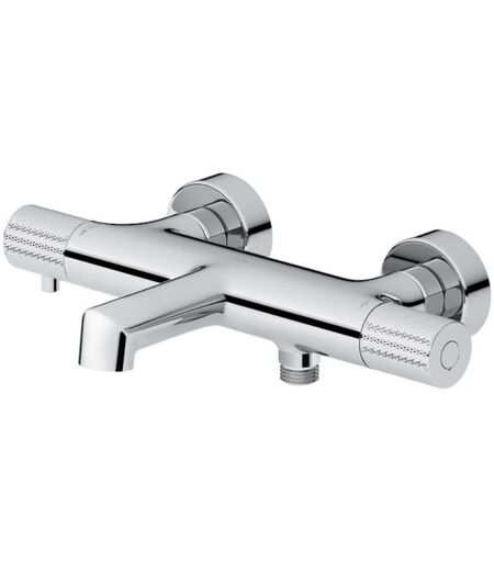Mitigeur thermostatique de baignoire couleur : chrome dimensions : 294 x 195 mm longueur du bec : 181 mm commande : par robinet installation : murale entraxe 150 mm, raccords S avec inverseur baignoire / douche Débit 14,73 et 15,02 l/min cartouche thermostatique verrouillage de sécurité à 38 °C avec mousseur corps de mitigeur froid grâce à SafeTouch raccord G 1/2’’ sans accessoires ...
