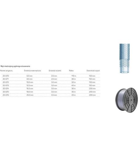 Tuyau en PVC avec renfort textile, conçu pour le transport sous pression de produits phytosanitaires, d'air, de produits chimiques légers, d'eau potable et de denrées alimentaires, conformément à la directive (UE) 10/2011 pour les simulants ABC-D2, plage de températures -10/+60 °C, sans phtalates, certifié PZH. Longueur : 30 m. Diamètre du trou : 16 mm. EAN : 5901828858338 ...