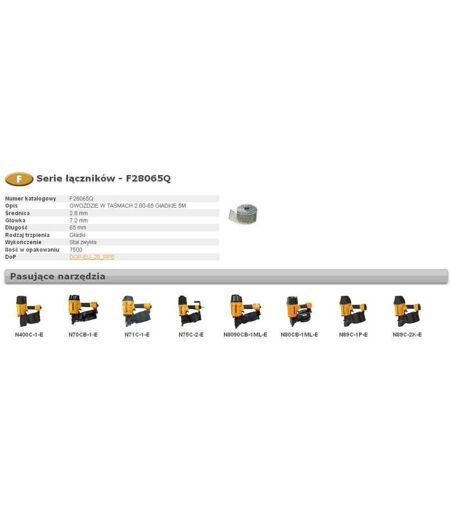 Série de fixations - F28065Q Numéro de catalogue F28065Q Description CLOUS EN BANDE LISSES 2,80-65 5M Épaisseur 2,8 mm Tête 7,2 mm Longueur 65 mm Type de tige Lisse Finition Acier doux Quantité par paquet 7500 Outils adaptés N400C-1-E N70CB-1-E N71C-1-E N75C-2-E N8090CB-1ML-E N80CB-1ML-E N89C-1P-E N89C-2K-E EAN : 5902013957348 ...