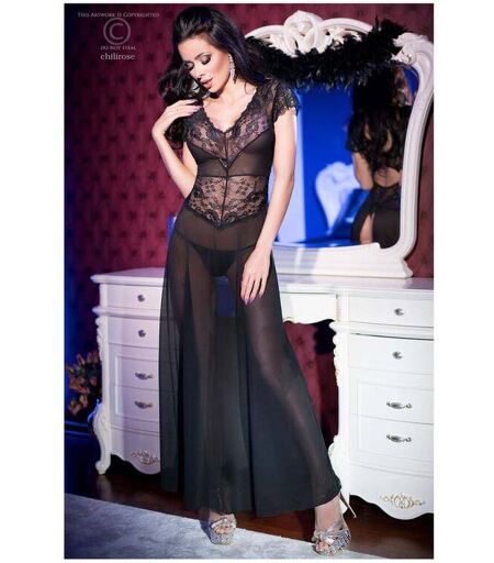 Séduisez votre moitié grâce à la Nuisette Princess Lace CR4167 de Chilirose, qui vous rendra sexy même pour aller dormir ! Cette magnifique nuisette vous rendra désirable à souhait grâce à sa coupe longue pour mettre votre corps en valeur. Son décolleté large en V sublimera votre poitrine et la dentelle noire vous rendra à la fois glamour et élégante. Votre partenaire ne pourra s'empêcher de vous dévorer du regard... La nuisette est entièrement composée de tissu transparent et de dentelle à l'avant comme à l'arrière, ce qui laissera entrevoir tout votre corps pour le plus grand plaisir de votre moitié. L'atout séduction, l'ouverture sur le dos avec un bijou brillant pour subblimer le tout. Fendue à l'arrière, votre nuisette sera idéale pour rendre vos soirées et vos nuits toujours plus torrides ! Un string assorti est inclus. Tailles S, M, L, XL. ...