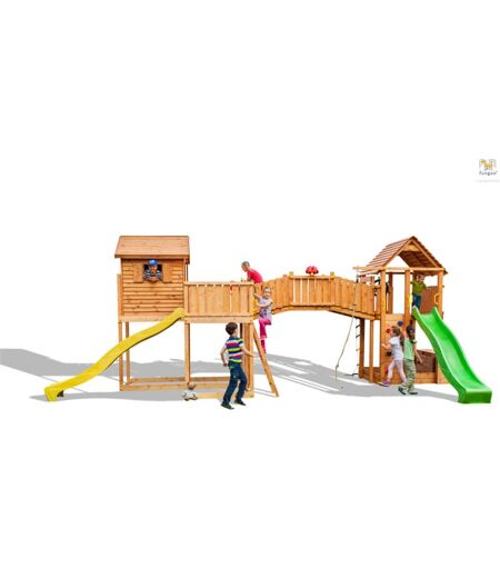 FUNGOO Aire de jeux maxi set sized plaza avec pont, cabane, toitures, 2 échelles, mur d'escalade, corde à nœuds, échelle de corde, bac à sable, coffre à