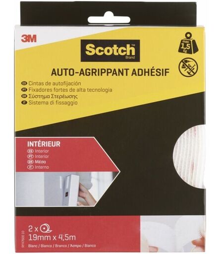 Fixation extra forte sans percer • Pratique et rapide • Repositionnable • Spécial intérieur Les auto-agrippants adhésifs de la gamme Scotch® se déclinent en plusieurs dimensions pour permettre une facilité au quotidien. Du rouleau auto-agrippant à la pastille, vous avez la possibilité de choisir le produit qui correspond à vos besoins. Simples d’utilisation, les auto-agrippants de la gamme Scotch® se fixent solidement et facilement sur différentes surfaces peintes et lisses, métal et plastique. Les auto-agrippants de la famille Intérieur sont idéaux pour les travaux de bricolage, la décoration et accrocher des objets légers jusqu’à 1,5kg. Couleur: Blanc Largeur (en mm): 19 Matière principale: Polypropylène Charge utile (en kg): 1.3 Longueur (en cm): 450 Produit emballé : hauteur (en cm): 18 Produit emballé : largeur (en cm): 14.6 Produit emballé : profondeur (en cm): 5.1 Produit emballé : poids (en kg): 0.149 ...