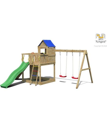 L'aire de jeux TreeHouse Fungoo Proposant plusieurs activités, l'aire de jeux pour enfants est parfaite pour amuser vos petites cet été ! L'aire de jeux TreeHouse Fungoo peut accueillir jusqu'à 12 enfants à la fois. Ainsi, vos enfants pour s'amuser avec leurs amis. C'est quand même plus rigolo d'amuser avec les copains ! Sur cette aire de jeux, dotée d'un toboggan, d'une balançoire double, d'un mur d'escalade, d'une rampe avec corde, d'un volant, d'une longue vue, d'un bac à sable, et d'une cabane en bois, vos enfants partiront à l'aventure vers leur imagination. Cette aire de jeux d'extérieur est fabriquée en pin sylvestre traité autoclave classe 3 FSC. Des matériaux durables et robustes, pour de nombreuses heures d'amusements au jardin. Pour conserver son aspect d'origine, il vous suffira simplement de lasurer le bois 1 fois par an. Équipement de l'aire de jeux Fungoo L'aire de jeux TreeHouse se compose de plusieurs jeux qui permettront de développer de nombreuses capacités, chez les enfants que ce soit mentales et physiques : Un toboggan de couleur vert avec glisse double vague mesurant 2,2 m. Une échelle à barreaux métalliques. Un portique doté de 2 balançoires rouges. Un mur d'escalade. Une rampe avec corde. Un bac à sable. Une cabane avec toiture synthétique waterproof. Un volant et une longue vue. L'aire de jeux extérieure TreeHouse convient pour les moyens et grands jardins. Longueur : 4,43 m Largeur : 5,01 m Hauteur : 2,72 m Surface : 22,19 m² Hauteur plateforme : 1,25 m Conseil : Laissez un périmètre de 2 m autour de la tour, et de 4 m de chaque côté du portique (à partir du mât central). Qualité de fabrication des aires de jeux en bois de la marque Fungoo Sécuritaires et de qualité, les aires de jeux en bois de la marque Fungoo bénéficient d'un réel savoir-faire avec une qualité de développement et de fabrication conformes aux normes européennes EN71. Installation de l'aire de jeux TreeHouse L'aire de jeux TreeHouse est livrée avec le nécessaire de montage : Kit d'ancrage au sol Jeu de fixation métalliques Ensemble d'outils d'installation Instructions d'installation "étape par étape" avec les règles de sécurité Pour la sécurité, des supports, des capuchons de protection et des poignées sont inclus. Comptez environ 8 heures à 2 personnes pour son montage. Les aires de jeux Fungoo sont destinées à un usage privé et familial, conformément à la norme européenne EN-71. Garantie L'aire de jeux TreeHouse bénéficie d'une garantie de 2 ans. ...