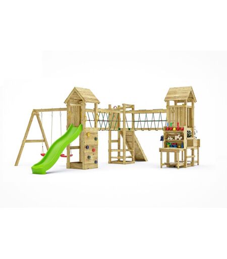 Transformez votre jardin en un véritable parc d'aventure avec cette aire de jeux XXL ! Équipée d’un toboggan vert de 2,2 m, de deux balançoires avec cordes réglables, d’une roue motrice rouge, et de nombreux modules pour l’imagination, cette aire de jeux offre des heures de plaisir pour vos enfants. Profitez aussi d’un téléphone jouet, d’une cloche, d’un module de cuisine avec évier et d’une jardinière pour compléter l'expérience de jeu. Le mur d'escalade avec 6 rochers et la passerelle d'escalade ajouteront des défis passionnants à l'aventure. Construite en bois de pin sylvestre autoclave classe 3 FSC, la structure est robuste, durable et respecte l'environnement. Vous pourrez facilement l'installer en 16 heures à 2 personnes grâce au kit d'outils d'assemblage inclus, tout en suivant le manuel de bricolage illustré étape par étape. Les ancrages de sécurité garantissent une stabilité optimale, et la hauteur de plateforme de 1,25 m est idéale pour des jeux en toute sécurité. Avec une ...