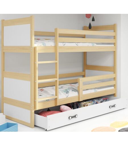 Interbeds - Lit superposé Rico 90x190 Bois Massif- Pin-Barrière- Sommier- Tiroir- Séparable en 2 lit-Sans matelas (Pin+blanc)