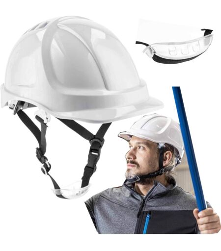 Ce casque de sécurité en plastique ABS est doté d'orifices de ventilation et de fentes de fixation pour casque antibruit. Des boucles latérales permettent la fixation de protections supplémentaires pour le visage, les yeux et l'ouïe. La coque résiste aux chocs à basse température et est extrêmement dure et résistante aux rayures. Le harnais à 6 points, fabriqué en sangle polyester très résistante, ne frotte pas comme les harnais en plastique. Une molette de réglage en nylon à l'arrière du casque assure un ajustement parfait à toutes les tailles de tête. Équipé d'une jugulaire à 4 points, il est parfaitement adapté aux conditions exigeant une protection efficace, une excellente ventilation et un champ de vision maximal. Fabriqué conformément à la norme EN 397. Conçu pour un usage professionnel. Il comprend des fentes de fixation pour casque antibruit et des boucles latérales pour la fixation de protections supplémentaires pour le visage, les yeux et l'ouïe ; matériau de la coque du ...