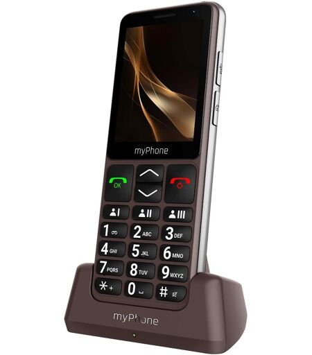 Téléphone Senior touches mémoires Autonomie 18 jours socle de charge Myphone Marron
