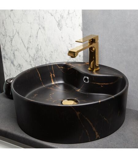 Kerra - Vasque à poser ronde en céramique tanza noir mat marbré doré Ø46 cm