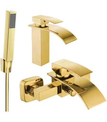 Spécification du produit : Matériau du robinet de lavabo : Laiton Finition : Doré Tête : Céramique Aérateur : Non Hauteur : 190 mm Portée du bec : 160 mm Matériau du robinet de baignoire : Laiton Finition : Doré Tête : Céramique Aérateur : Non Portée du bec : 170 mm Matériau du pommeau : Plastique Finition du pommeau : Doré Nombre de fonctions : 1 Raccord : G 1/2" Hauteur du pommeau : 215 mm Largeur du pommeau : 30 mm Matériau du support : Plastique Finition du support : Doré Type de montage : Mural Dimensions du support : 60x44 mm Distance au mur : 42 mm Matériau du tuyau : PVC Finition du tuyau : Doré Longueur du tuyau : 150 cm Raccord : 1/2" Embouts en laiton Surface lisse pour un entretien facile Embouts pivotants pour éviter la torsion Matériau flexible résistant à l'étirement et aux flexions ...