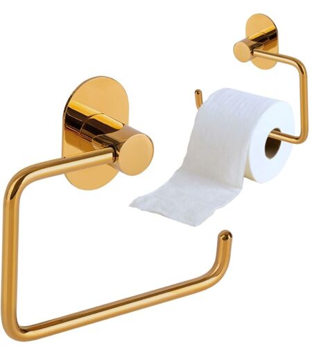 LAVEO MIRI Porte-papier toilette pour WC, mural, autocollant, à visser, doré Une solution fonctionnelle sous la forme d'un porte-papier toilette en chrome apporte un style moderne et facilite l'aménagement de l'espace dans la salle de bain ou les toilettes. Il convient de prêter attention à deux méthodes de montage différentes : l'utilisation de ruban adhésif ou le vissage au mur, ce qui protège les surfaces des dommages et facilite l'installation. Un ruban adhésif puissant assure une fixation facile et sûre du support sur diverses surfaces telles que le carrelage, le verre, le métal ou le bois. L'option boulonnée garantit une stabilité et une durabilité exceptionnelles. Le porte-papier toilette esthétique est équipé d'un élément dévissable avec une fixation cachée, ce qui ajoute à son aspect élégant. Cela lui confère un aspect extrêmement élégant, tout en garantissant la solidité et la certitude que le papier ne bougera pas pendant l'utilisation. Fabriqué en acier, il remplit non ...