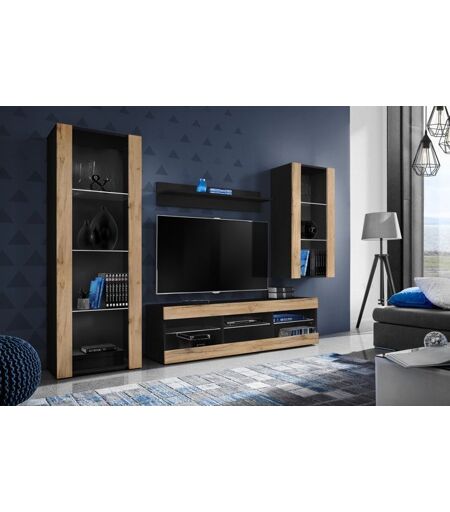 Meuble Tv Tivoli Set Medio Komodee - Sans Led - Bois Naturel Mat & Noir - L 195cm X H 159cm X P35cm