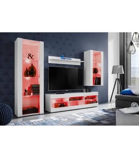 Meuble Tv Tivoli Set Medio Komodee - Led Rgb - Blanc Mat & Blanc - Façades En Mat - L 195cm X H 159cm X P35cm