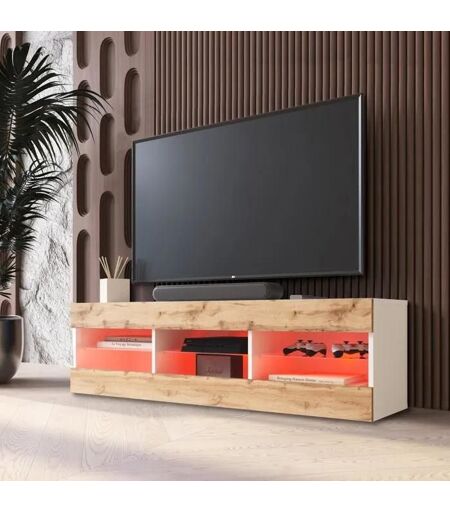 Meuble Tv Tivoli Rtv Komodee - Led Rvb - Bois Naturel Et Blanc - Facades En Mat - 140 X 41 X 35 Cm
