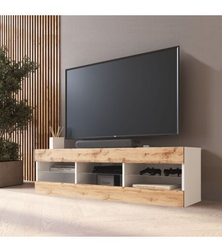 Meuble Banc tv Tivoli 140, Blanc/Wotan, Largeur 140cm x Hauteur 40,5cm x Profondeur 35cm, sans led, pour Salon, Chambre - Komodee