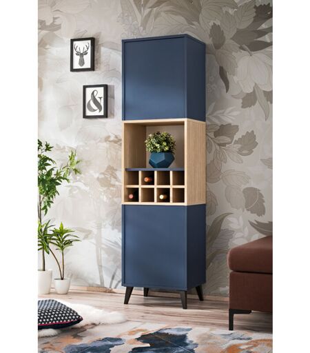 komodee Vitrine Armoire Fondi Avec Casier à Vin, 2 Portes, Style Scandinave, Pour Salon, Cuisine, Salle à Manger, Bureau, Bleu, Bois Clair, 173x35x46