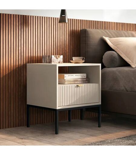 La table de nuit NANAIMO est une solution élégante et fonctionnelle pour la chambre à coucher. Ses dimensions compactes permettent une arrangement pratique de l'espace entre le lit et le mur, offrant un emplacement pour une lampe de nuit ainsi que du rangement pour des bric-à-brac dans le tiroir. Fabriquée à partir de matériaux durables, elle dispose d'un panneau rainuré en MDF et d'un cadre en acier peint en poudre. Disponible en cinq couleurs (cachemire, blanc, vert, noir et gris), elle s'intègre parfaitement dans différents styles d'intérieur. ...