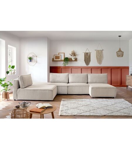 Canapé d'angle fixe 100% modulable NIHAD tissu velours côtelé 2 chauffeuses, 1 pouf et 2 méridiennes beige BOBOCHIC 6 places
