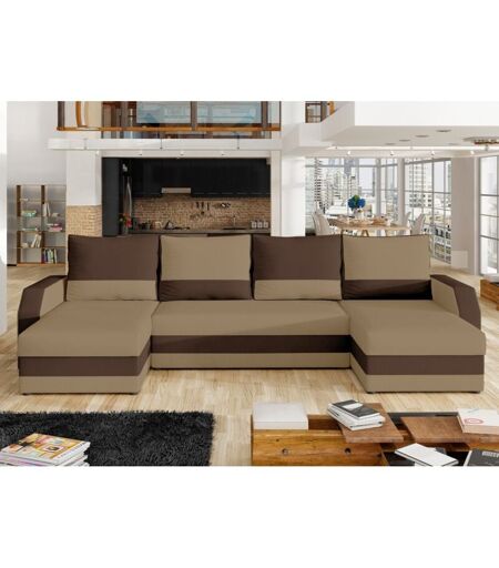 Les Tendances - Canapé d'angle convertible panoramique bicolore tissu marron clair et marron foncé Nordy 307cm