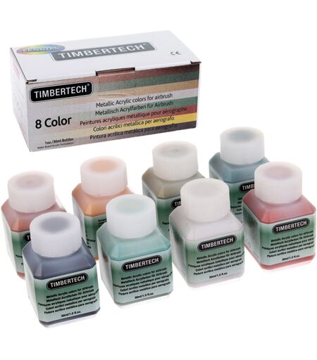 Coffret professionnel de peintures acryliques métallisées Timbertech pour aérographe. 8 flacons de 30 ml chacun. Peintures à l'eau. Les peintures métallisées offrent des couleurs vives et se mélangent bien. Les peintures conviennent à toutes les surfaces et ont été spécialement formulées pour adhérer aux plastiques et aux polyesters. Leur texture les rend idéales pour les détails fins et les graphismes miniatures. La peinture peut être diluée avec de l'eau et toutes les couleurs peuvent être mélangées entre elles. Le produit est sans solvant et ininflammable. Les peintures ne contiennent pas de plomb ni de substances nocives pour la santé. La peinture peut être enlevée immédiatement après la peinture avec de l'eau ou un peu d'alcool. Après séchage, la peinture devient imperméable et durable. ...