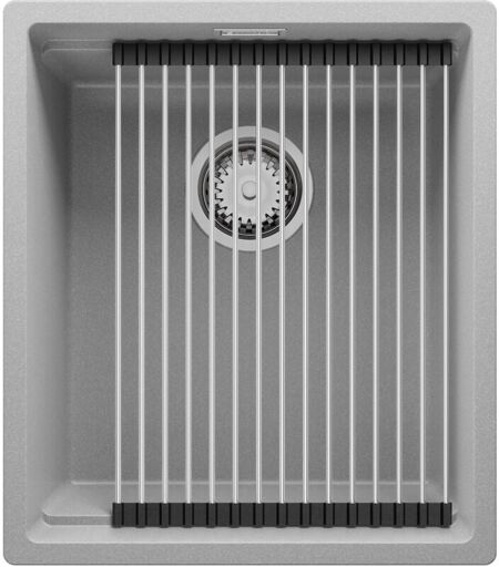 Primagran - Evier Sous Plan 41x47cm, Evier en Granit 1 bac + Kit de Vidage + Égouttoir Enroulable, Évier au meuble 45cm - Prague, Gris
