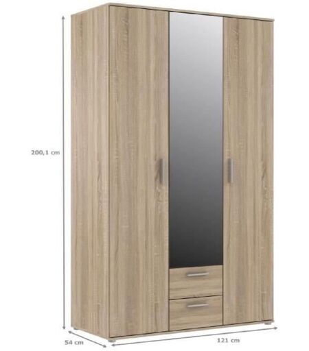 Optimisez votre rangement avec l'armoire SELKEÄ Découvrez l'armoire SELKEÄ, équipée de 3 portes battantes, dont une avec miroir, ainsi que 2 tiroirs intégrés. Cette solution de rangement vous permet d'organiser aisément vos vêtements grâce à ses 4 tablettes ajustables et sa tringle à habits. Qualité et fabrication Fabriquée en Europe, l'armoire SELKEÄ est conçue avec des panneaux de particules de haute qualité, offrant un style contemporain et design qui s'intègre harmonieusement dans votre intérieur. Dimensions Largeur : 121 cm Profondeur : 54 cm Hauteur : 200,1 cm ...