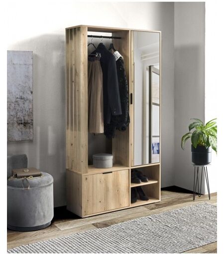 Meuble d'entrée EMILIO coloris chêne artisan 100x33 H.189,4 cm Ce dressing compact peut servir comme meuble d'entrée qu'armoire penderie, Ce Dressing complet comprend : - Le Porte manteau penderie avec panneau coloris chêne: 55,5cm x H. 143,5 cm- Etagère fermée au-dessous de la penderie: 55,5x33 cm x H. 45,9- L' Armoire avec miroir et 2 étagères ouvertes: 39,5x33 cm H.189,4 cmLargeur: 100 cmProfondeur: 33 cmHauteur: 189,4 cmEpaisseur : 16 mmPoids: 54 kg Matière : - panneau de bois stratifié, coloris chêne artisan- chant - placage PVC- dos de l'armoire - panneau HDF- charnières - métal- cintre noir - métal- poignées - métalInstallation : meuble à poser Ouverture : Les poignées sont en métal Disponible en coloris chêne artisan/noir [VOIR]Nombre de colis : x2 Conseils d'entretien:¿ Il est conseillé d'utiliser un chiffon en coton humidifié avec de l'eau tiède pour le nettoyage. Ne pas utiliser de produits abrasifs, ni de solvant.¿ Essuyer avec un chiffon en coton sec Livraison et montage :¿ Contenu de la livraison : le meuble sans les décorations¿ Livré démonté "à monter soi-même"¿ Les instructions de montage, claires et faciles à suivre, sont livrées avec l'article Fabrication européenne. ...