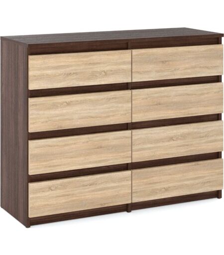 Meubles Stiv Commode Wenge - 120 cm - 8 tiroirs - Élégante et fonctionnelle pour salon Transformez votre espace avec la commode Meubles Stiv, alliant élégance et fonctionnalité. Design raffiné et pratique ? la recherche de la commode idéale qui marie un design moderne ? une fonctionnalité optimale ? La commode Meubles Stiv en wenge est la solution parfaite pour votre salon. Avec son style contemporain et ses lignes épurées, elle s'int?gre harmonieusement ? tout type d'intérieur, tout en offrant un espace de rangement généreux grâce ? ses 8 tiroirs spacieux. Caractéristiques techniques exceptionnelles Découvrez les spécifications de cette pi?ce maîtresse de votre mobilier : Largeur : 120 cm Hauteur : 92,5 cm Profondeur : 33,5 cm Poids : 56 kg Matériau : Panneau laminé Couleur : Wenge et ch?ne sonoma Épaisseur du panneau : 16 mm Syst?me de tiroirs : Panneaux sans poignées Type de glissi?res : Rouleaux Profondeur du tiroir : 28 cm Largeur du tiroir : 52 cm Montage : Meuble ? assembler ...