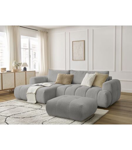 Canapé d'angle convertible FUJI tissu bouclette avec pouf gris clair angle gauche BOBOCHIC 3 places Angle gauche