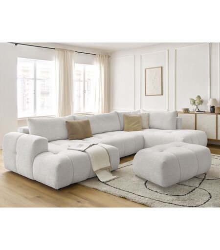 Canapé panoramique convertible FUJI tissu bouclette avec pouf blanc angle gauche BOBOCHIC 5 places Angle gauche