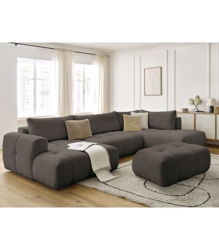 Canapé panoramique convertible FUJI tissu bouclette avec pouf marron angle gauche BOBOCHIC 5 places Angle gauche