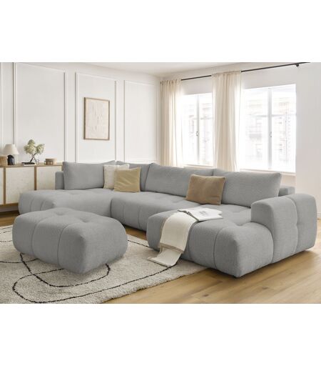 Canapé panoramique convertible FUJI tissu bouclette avec pouf gris clair angle droit BOBOCHIC 5 places Angle droit