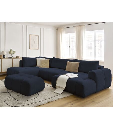 Canapé panoramique convertible FUJI tissu bouclette avec pouf bleu foncé angle droit BOBOCHIC 5 places Angle droit