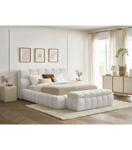 Lit coffre MONT-BLANC + Bout de lit MONT-BLANC tissu bouclette blanc 160x200 + bout de lit 140 BOBOCHIC 160x200 + bout de lit 140